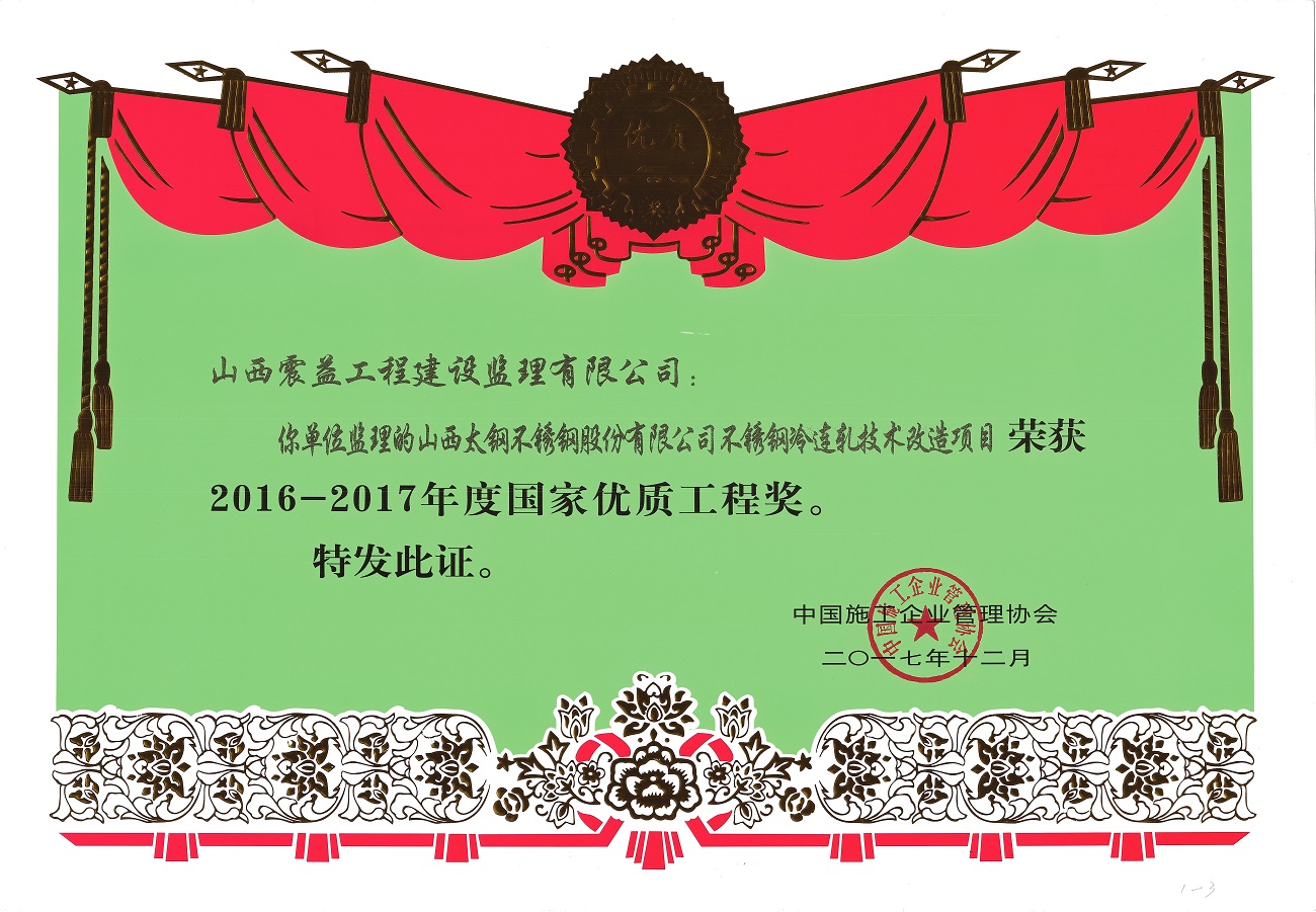 公司先后承擔(dān)了冶金、機(jī)械、電力、礦山、市政、環(huán)保、房屋建筑等工業(yè)及民用建設(shè)大中型工程項(xiàng)目1000余個(gè),足跡遍及國(guó)內(nèi)二十多個(gè)省市,在全國(guó)各地四千余個(gè)制造廠家進(jìn)行了駐廠設(shè)備監(jiān)理,工程監(jiān)理也立足省內(nèi)輻射全國(guó)多個(gè)省區(qū)乃至國(guó)外。多年來(lái),我們憑著嚴(yán)格監(jiān)理、優(yōu)質(zhì)服務(wù)的工作作風(fēng)贏得業(yè)主的信任和好評(píng),受監(jiān)工程質(zhì)量合格率均為100%。由我公司監(jiān)理的太鋼7.63m焦?fàn)t(及配套化產(chǎn))工程、450㎡燒結(jié)工程、4350m3高爐工程、400萬(wàn)噸煉鋼/連鑄工程、2250mm熱軋工程、新不銹鋼冷軋工程、熱軋加熱爐工程、冶煉廢水處理工程、BOC制氧工程、40萬(wàn)噸及50萬(wàn)噸不銹鋼冷軋工程、制鐵煉鋼節(jié)能減排660㎡燒結(jié)機(jī)工程、不銹鋼冷軋光亮板結(jié)構(gòu)調(diào)整工程、型材系統(tǒng)改造一期徑鍛機(jī)工程、加工廠礦渣超細(xì)粉二期工程、2250mm熱連軋罩式爐工程、2250mm熱連軋新建鋼卷表面處理線工程、袁家村鐵礦項(xiàng)目、不銹冷連軋技術(shù)改造工程、硅鋼冷連軋技術(shù)改造工程等等多項(xiàng)工程項(xiàng)目均獲得了“冶金工業(yè)優(yōu)質(zhì)工程”獎(jiǎng);日貸清潔生產(chǎn)90噸電爐工程獲山西省“汾水杯”質(zhì)量獎(jiǎng);太原濱河小區(qū)、19宿舍、太鋼2*300MW自備電廠、太原市不銹鋼工業(yè)園區(qū)等工程獲太原市“******文明施工樣板”工地;太鋼不銹2*300MW自備電廠改擴(kuò)建煙筒構(gòu)筑物工程、太鋼2*300MW空冷供熱機(jī)組儲(chǔ)煤筒倉(cāng)建筑工程、山西太鋼不銹鋼科技冷軋精密帶鋼工程等獲“山西省優(yōu)良工程”;1350 m3高爐、400萬(wàn)噸煉鋼/連鑄工程獲得******建設(shè)工程“魯班”獎(jiǎng)、不銹冷連軋技術(shù)改造工程獲“******優(yōu)質(zhì)工程獎(jiǎng)”。太鋼150萬(wàn)噸不銹鋼系統(tǒng)工程同時(shí)獲******“建國(guó)60年來(lái)經(jīng)典暨精品工程”獎(jiǎng)、“******優(yōu)質(zhì)工程金質(zhì)獎(jiǎng)”、******工程建設(shè)“魯班”獎(jiǎng)三項(xiàng)大獎(jiǎng)。